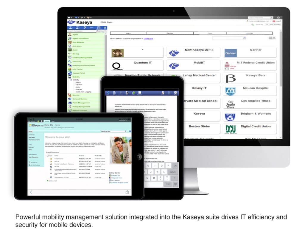 Managing and securing access to company data on mobile devices can be challenging, especially in environments where personal devices are increasingly used for business purposes alongside company-owned devices. Acquiring separate tools for Bring Your Own Device (BYOD) management and Mobile Device Management (MDM) only add to the cost and complexity of mobility management. Release 9 of Kaseya Enterprise Mobility Management (EMM) overcomes these challenges by providing one elegant solution that enables MSPs and mid-market enterprises to efficiently manage and secure company data on all mobile devices, whether company- or employee-owned. Available at a market disruptive price, Kaseya EMM gives IT administrators complete control of company-owned mobile devices, including Mobile Application Management (MAM), along with secure BYOD management capabilities for employee-owned devices, using encrypted containerized applications.
